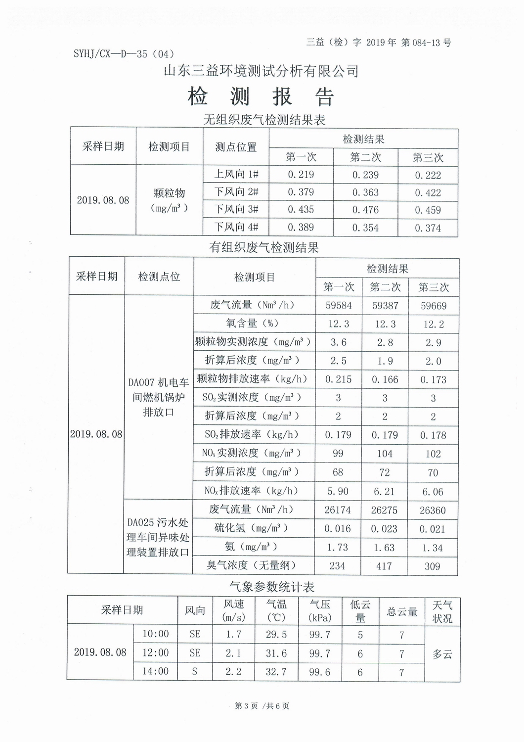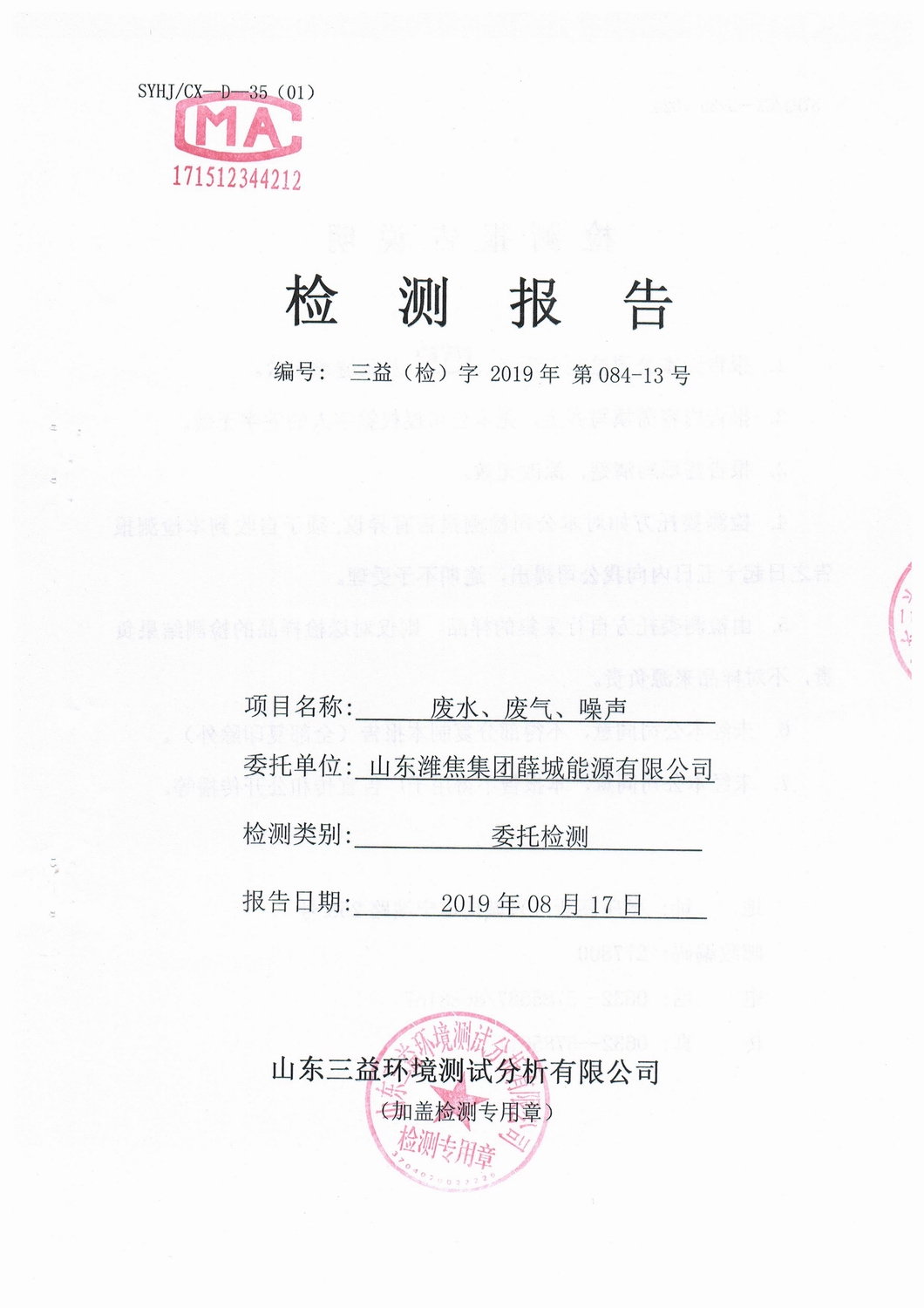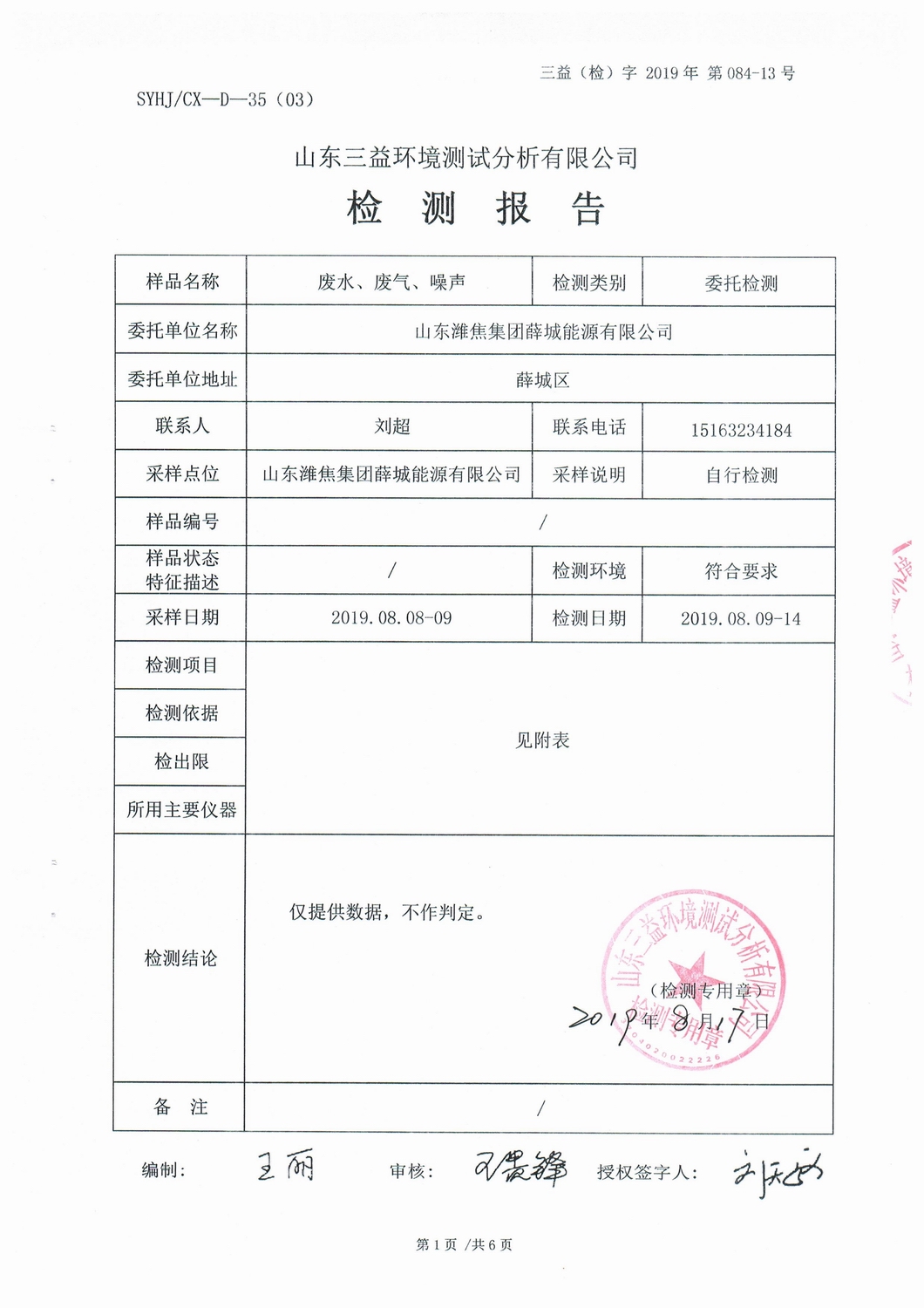 山東濰焦集團薛城能源有限公司8月份檢測報告