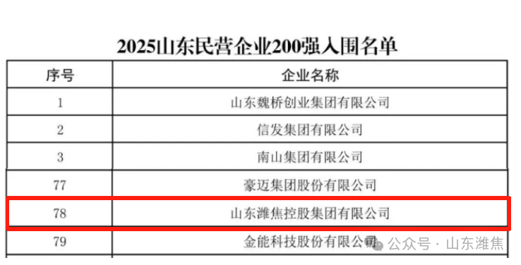 近日,山東省工商聯(lián)、省發(fā)展改革委、省科技廳、省人力資源社會(huì)保障廳、省農(nóng)業(yè)農(nóng)村廳、省商務(wù)廳、省稅務(wù)局、省市場(chǎng)監(jiān)管局、省總商會(huì)共同組織開展了2025山東民營(yíng)企業(yè)百?gòu)?qiáng)系列榜單發(fā)布活動(dòng)。山東濰焦控股集團(tuán)有限公司榮登“2025山東民營(yíng)企業(yè)200強(qiáng)”第78位。
